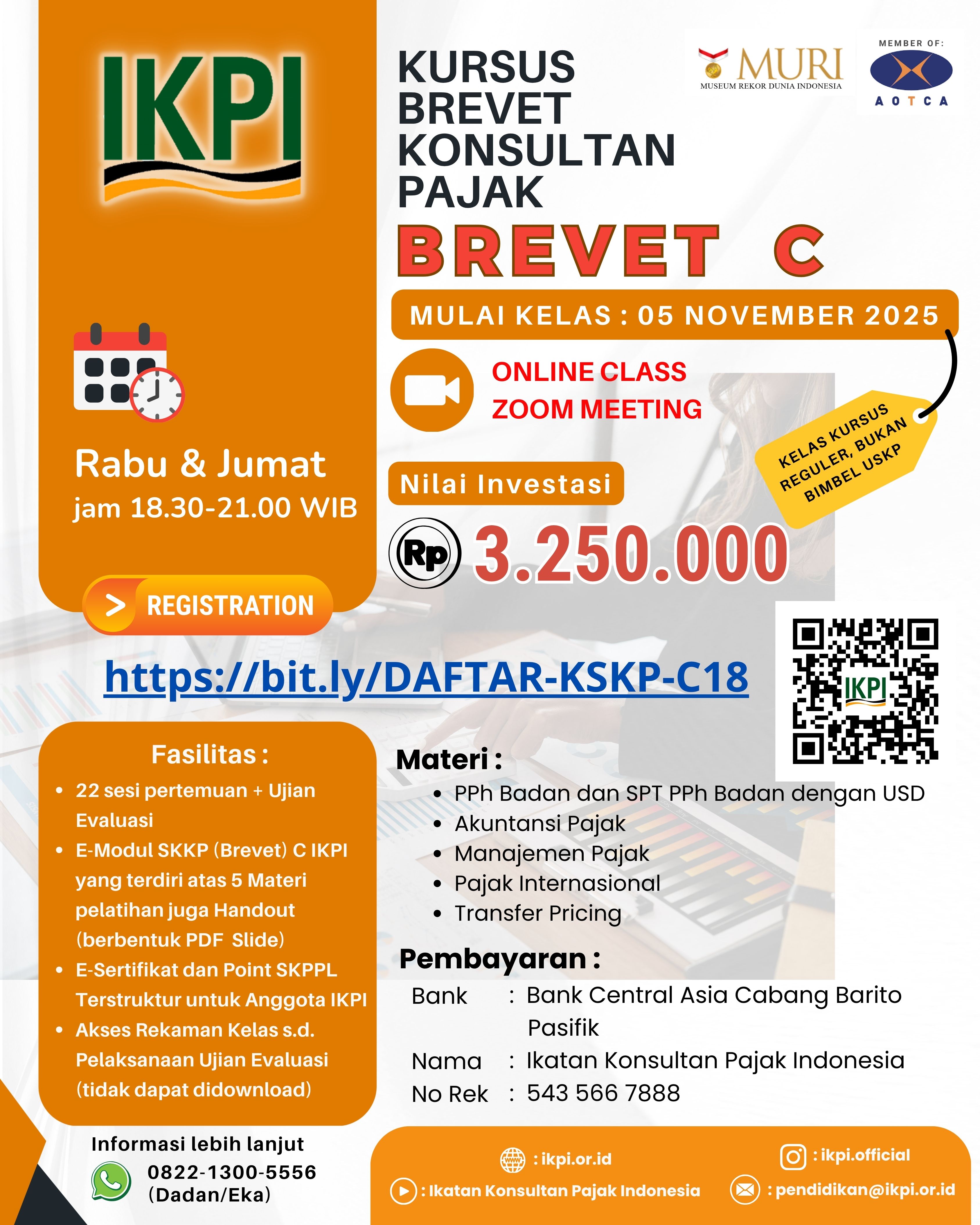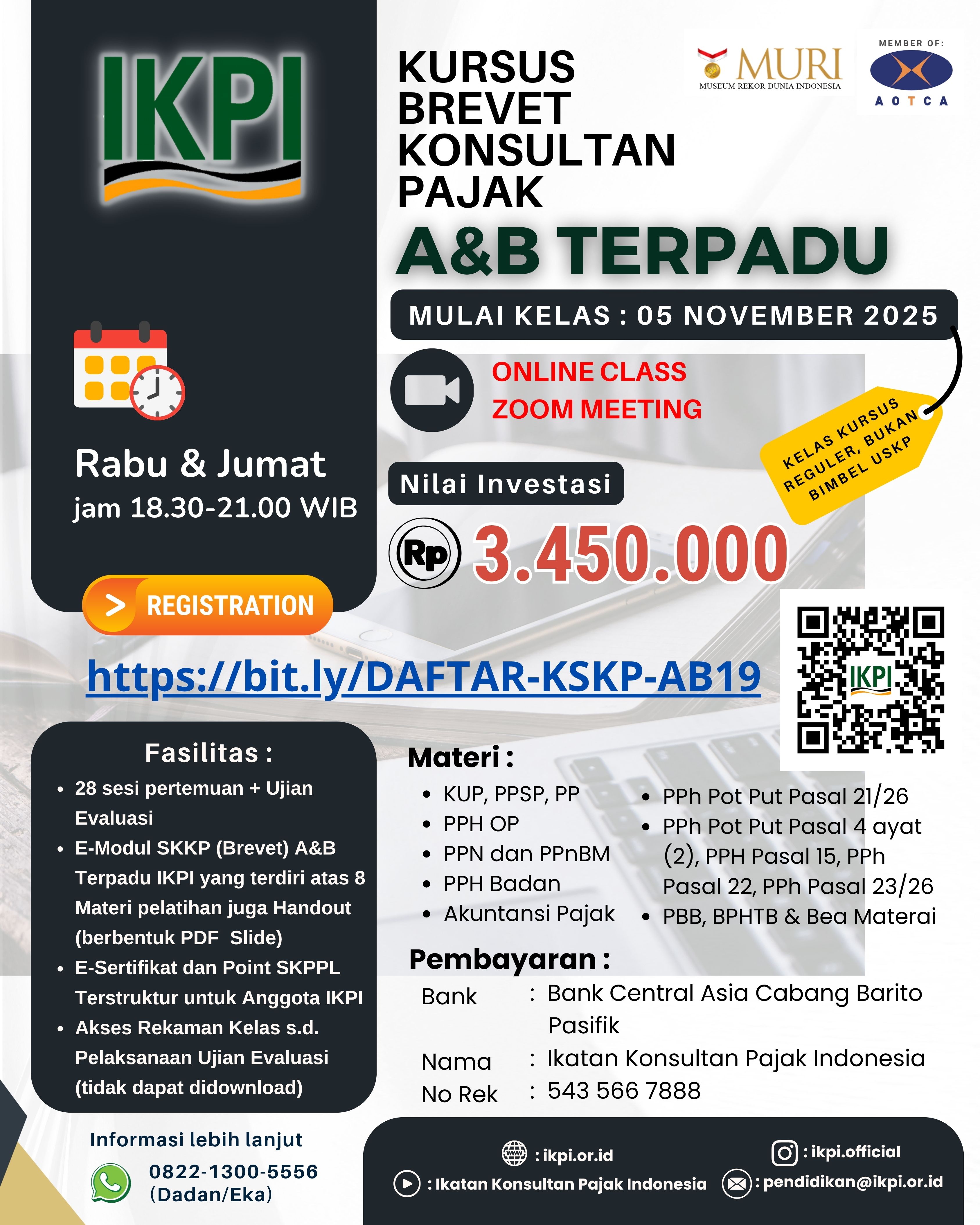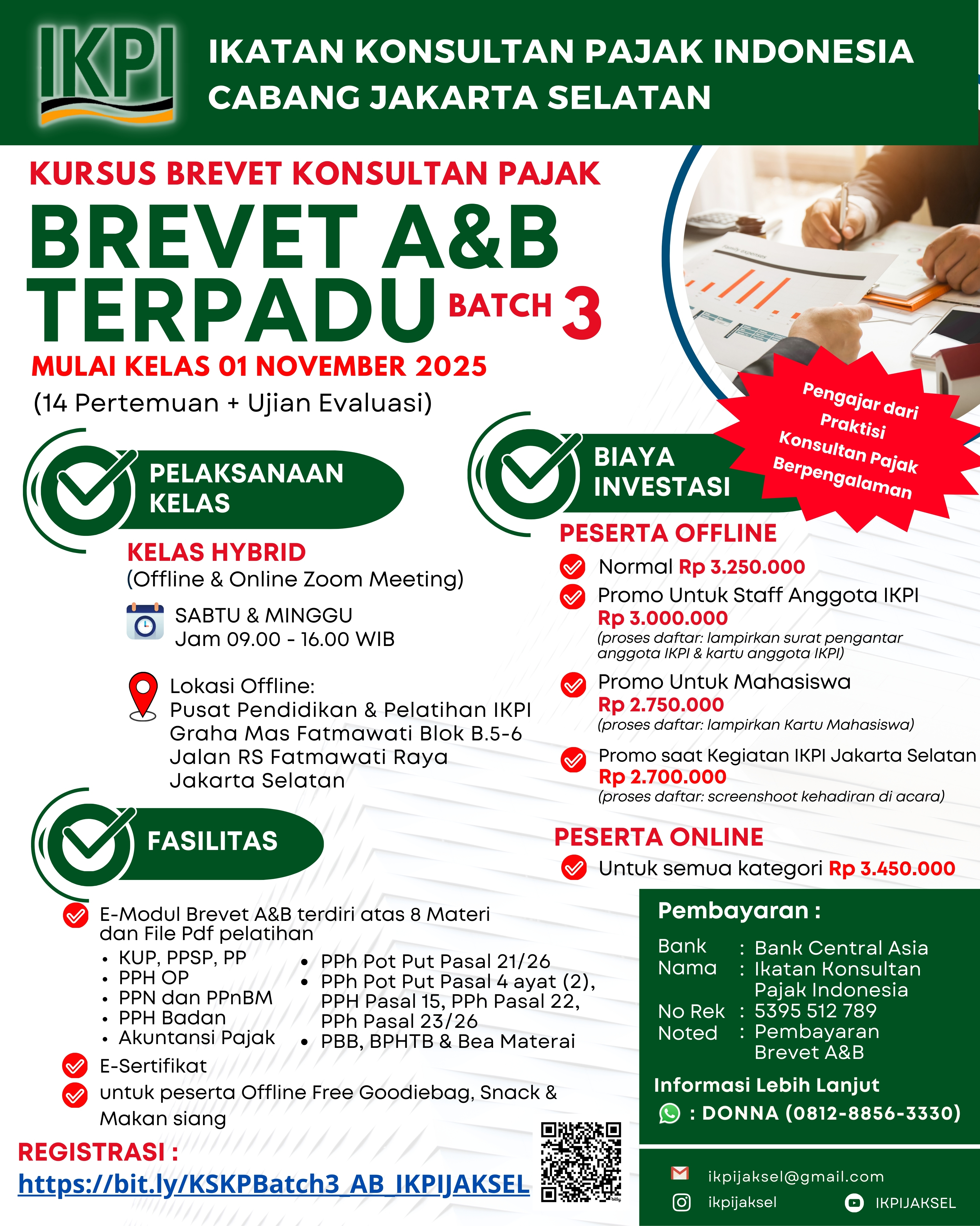 Penyelenggara : IKPI Cabang Jakarta Selatan Lokasi Pembelajaran : Graha Mas Fatmawati Blok B.5-6, Jalan RS Fatmawati Raya Jakarta Selatan | Offline | Daftar Lihat |